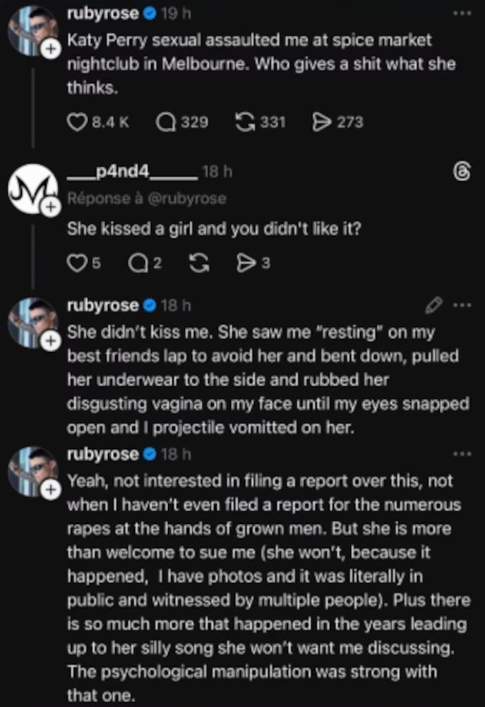 “Las acusaciones que circulan en redes sociales por parte de Ruby Rose sobre Katy Perry no solo son categóricamente falsas, sino que constituyen mentiras peligrosas e irresponsables”, aseguró.