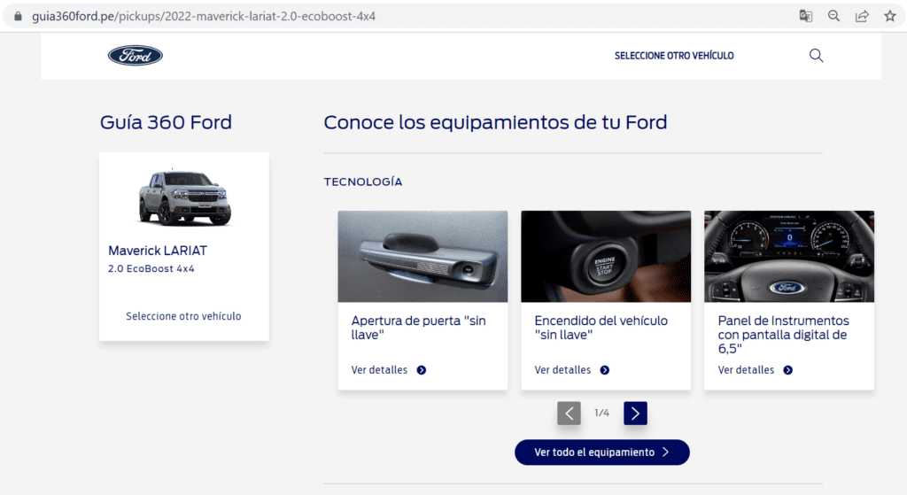 La Guía360 recorre a fondo el interior y exterior de los vehículos que Ford comercializa localmente, tales como Maverick, Ranger Raptor, Ranger, Territory, Bronco Sport, entre otros; haciendo énfasis en sus principales atributos en materia de motorización, tecnología, seguridad y confort. En el caso de los modelos de Raza Fuerte, se incorpora información sobre performance y capacidad off-road. Asimismo, la herramienta ofrece una experiencia interactiva con visión 360°, que permite navegar dentro de los modelos y revisar cada funcionalidad con información, videos e imágenes.