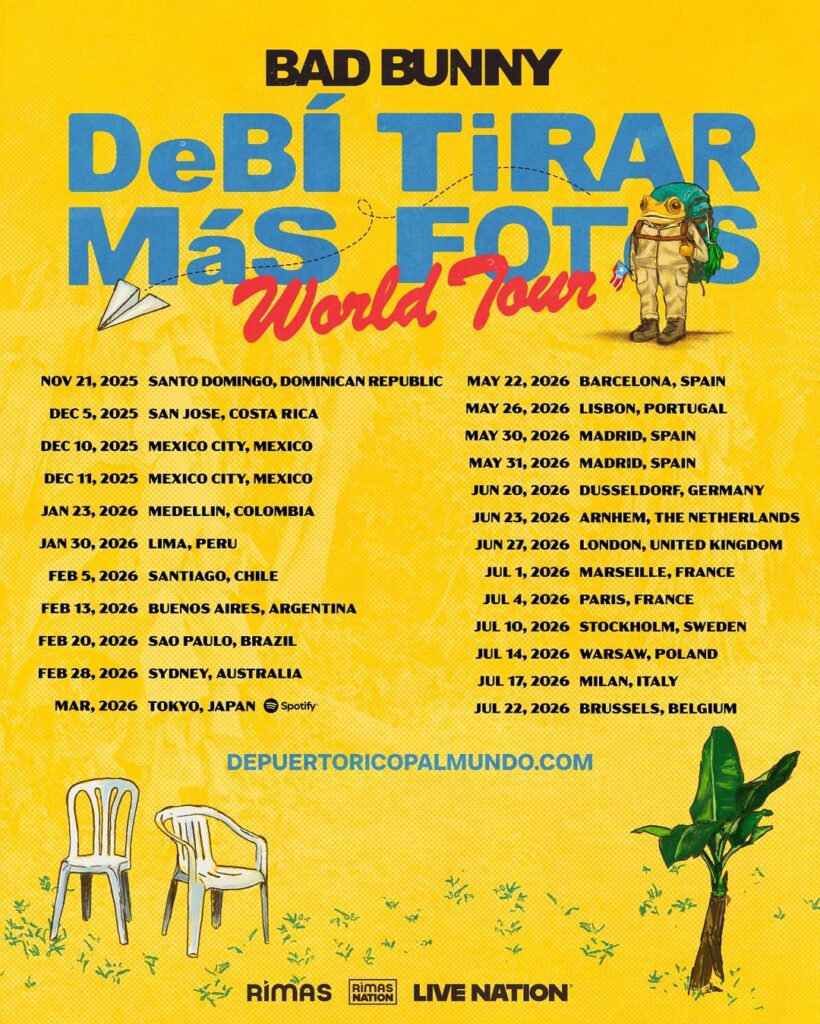A través de una publicación en redes sociales, el cantante anunció las fechas y lugares de sus presentaciones con su ‘Debí Tirar Más Fotos World Tour’, que iniciará en República Dominicana el 21 de noviembre de 2025.