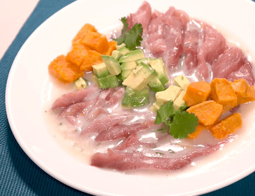 Para el ceviche limpiar y hornear el camote por 25 minutos. Porcionar el pescado en láminas, condimentar con sal. En un plato colocar el pescado e intercalarlo con láminas de palta. Bañar con la leche de tigre. decorar con el camote cortado en cubos y disfrutar.