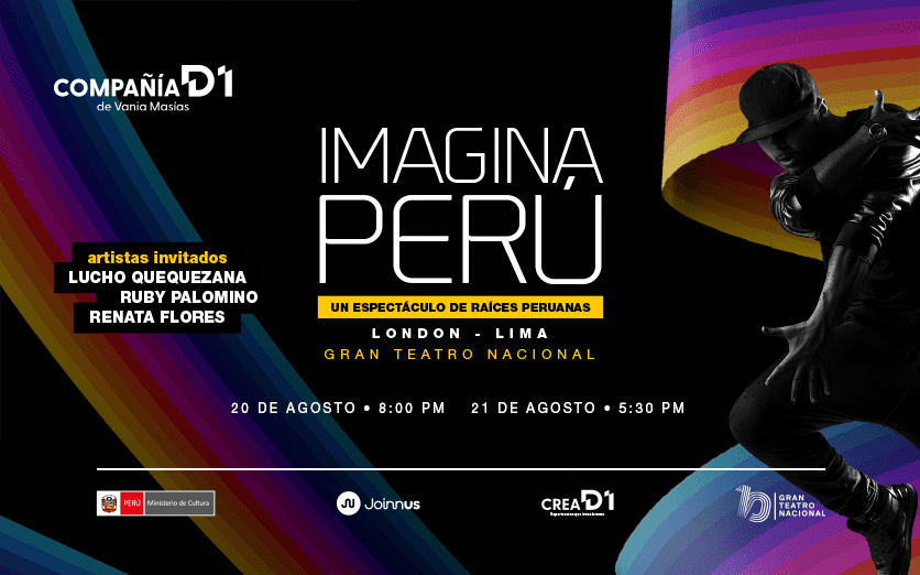 Después de su éxito en Londres, la compañía D1, dirigida por Vania Masías, presenta un espectáculo innovador de raíces peruanas. Es una pieza de teatro físico y danza, emocionarte desde el principio, con cuatro historias de jóvenes peruanos cargadas de esperanza, que serán narradas gracias al despliegue coreográfico y la fuerza audiovisual. Imagina Perú contará con invitados especiales, Lucho Quequezana, Renata Flores y Ruby Palomino.