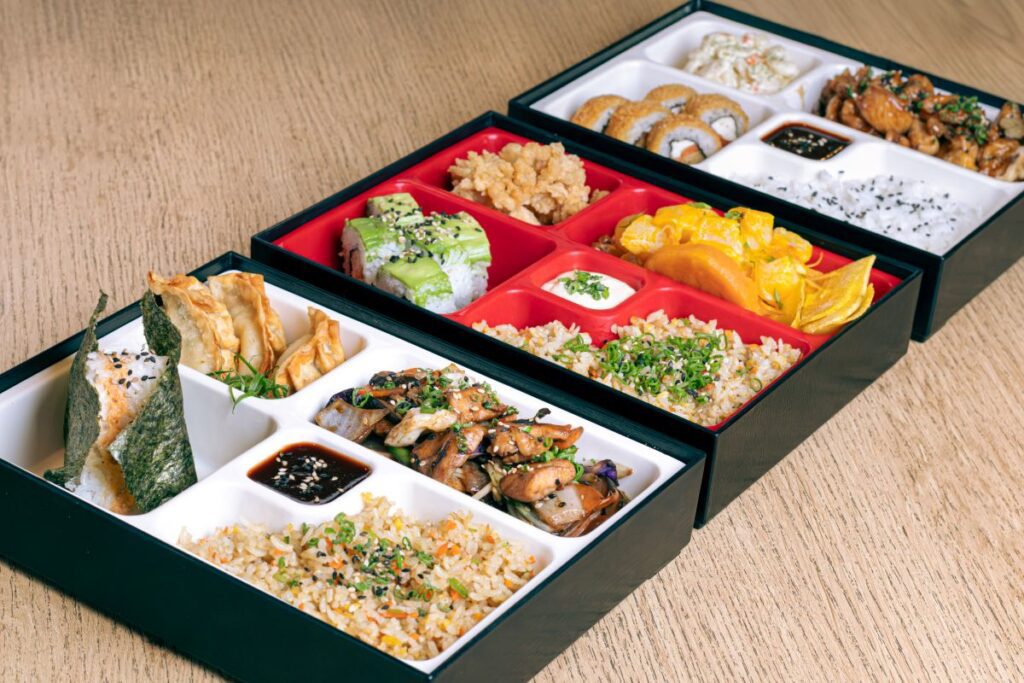 Cada obento incluye combinaciones completas que integran proteína, acompañamientos, arroz o ensaladas frescas, además de entradas japonesas que buscan equilibrio, variedad y presentación visual estilo gourmet.