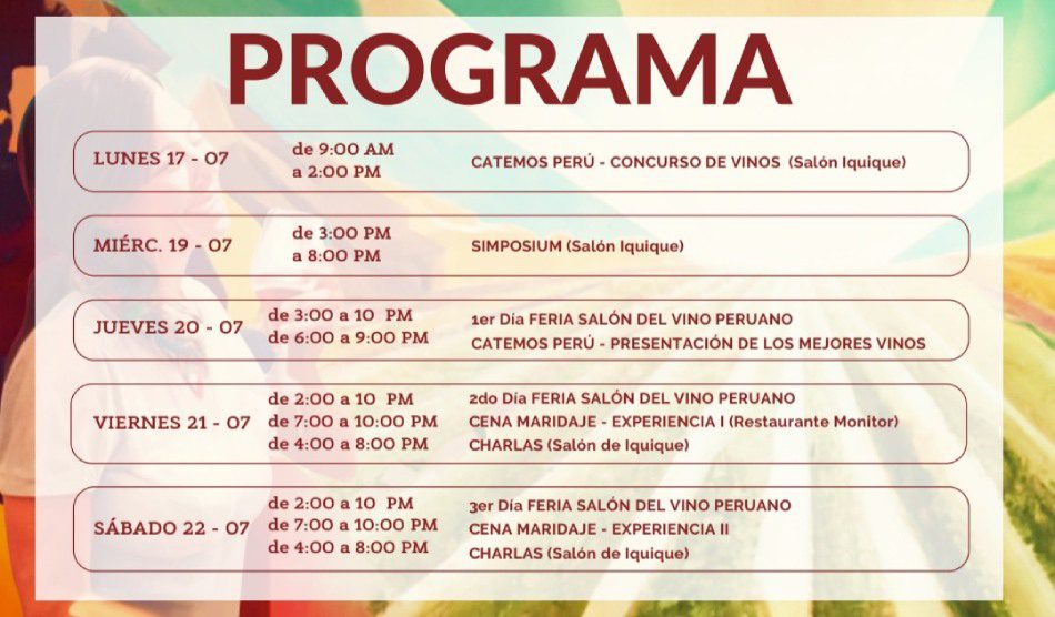 Este año, la Séptima Edición del Salón del Vino Peruano (SVP7.7) llega con siete actividades alrededor de este importante evento, que reunirá 30 productores de las regiones más destacadas como Lima, Ica, Arequipa, Moquegua, Tacna, Apurímac y La Libertad del 17 al 22 de julio, en el Centro Naval de San Borja y espera una convocatoria mayor a los 3,000 asistentes. Gracias a «Peruvino».