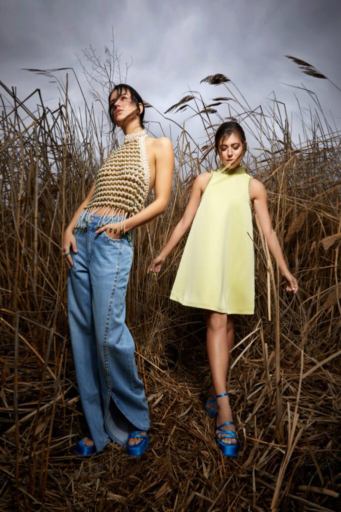 Las piezas clave comprenden una serie de mini vestidos, con dos estilos de color verde esmeralda y amarillo citrino elaborados en poliéster reciclado y amplificados con lentejuelas hechas de botellas de plástico PET recicladas, así como pedrería y cuentas hechas de estantes y cajas de exhibición de plástico reciclado. Mientras tanto, un mini vestido blanco perla adornado se crea a partir de una mezcla de lino y viscosa, usando viscosa trazable Livaeco by Birla Cellulose procedente de bosques sostenibles certificados.