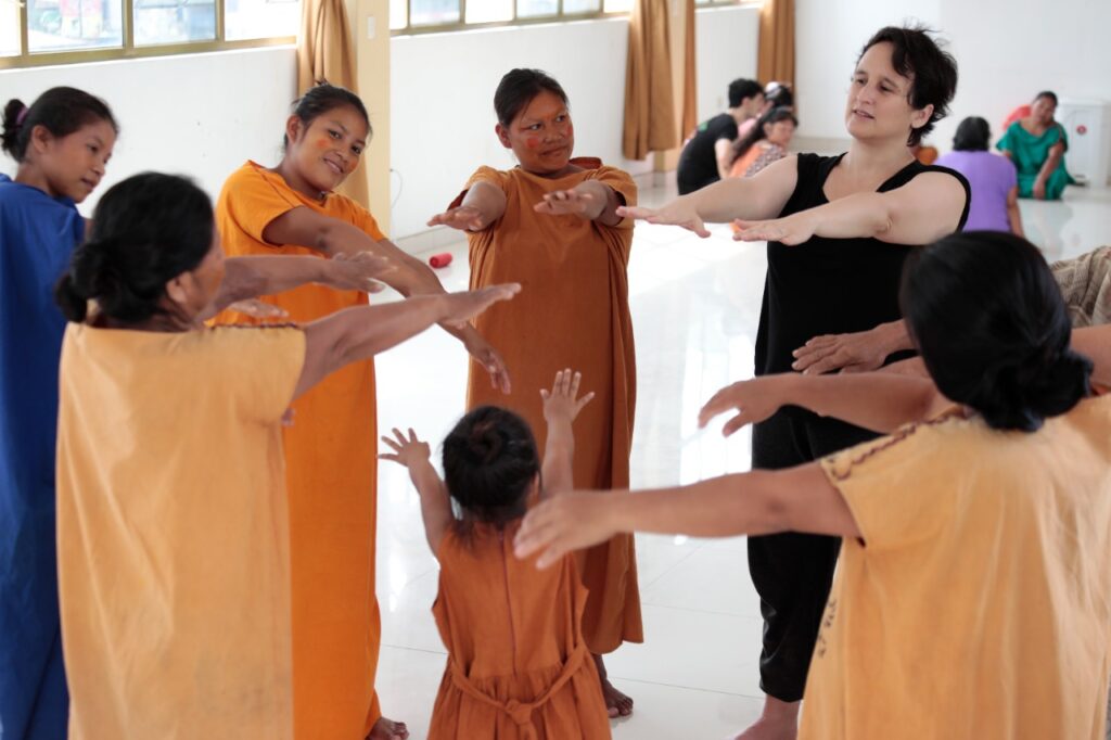 En la composición de la danza que se presentará este sábado, trabajaron lo simbólico con imágenes vinculadas al cuerpo y a la naturaleza. Las participantes crearon en medio de su propio entorno natural, en algunos casos cerca del río, con la fuerza de su simbología. Las mujeres se conectaron con sus memorias y compartieron sus historias como parte de un proceso de reparación. Se fue desarrollando una gestualidad, simbolizando la vida en el cuerpo. Luego se tradujo al movimiento, a una expresión física a partir del testimonio. Ellas mismas crearon los cánticos, los movimientos y sus propias vestimentas para esta presentación.