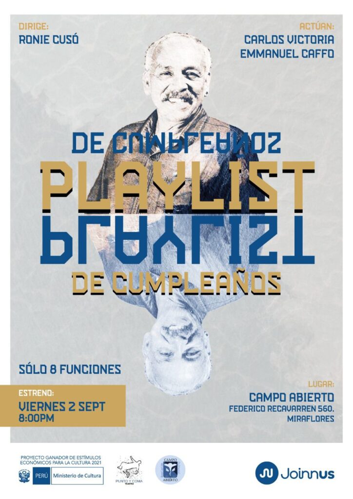 Playlist de cumpleaños, la obra que se estrenó en el 2020 de manera virtual llega a Campo Abierto (Calle General Recavarren 560, Miraflores), gracias a los Estímulos Económicos para las Artes Escénicas del Ministerio de Cultura del Perú (MINCUL).